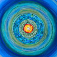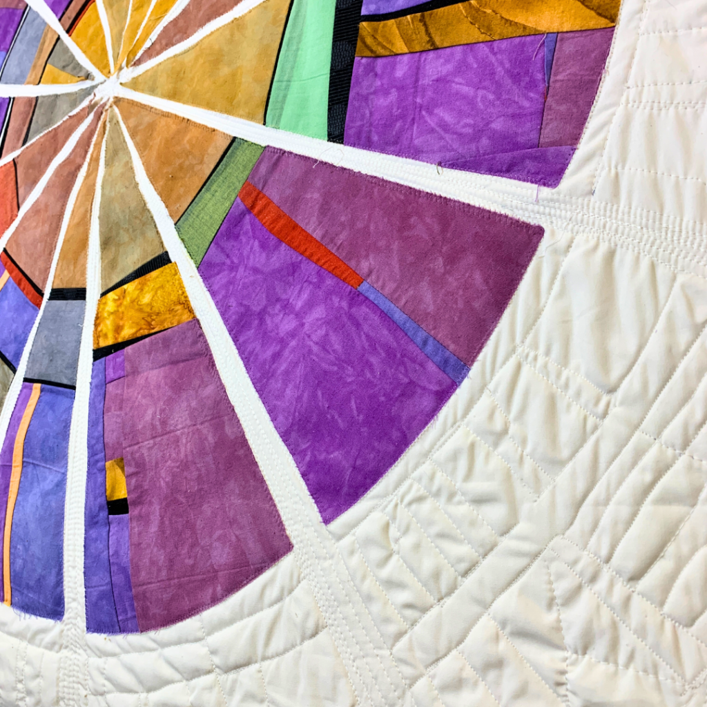 This quilt evolved by imagining the rings of an old, wise tree radiating out from the center, connecting with every part. There is no perfect symmetry but the colors are warm and inviting.