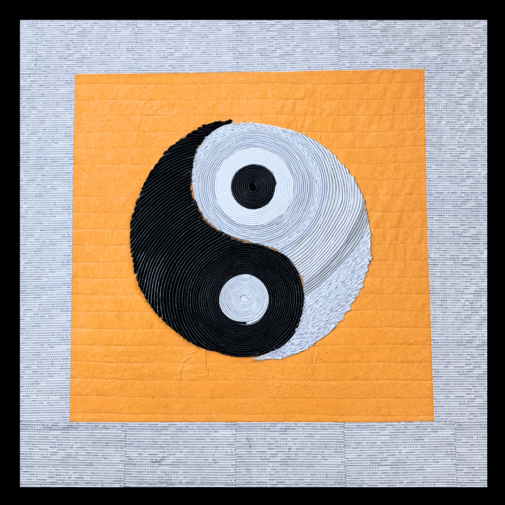 I selected the YinYang symbol for Wisdom and used discarded high tech power cords to create the shapes which I stitched onto a firm fiber-based material.